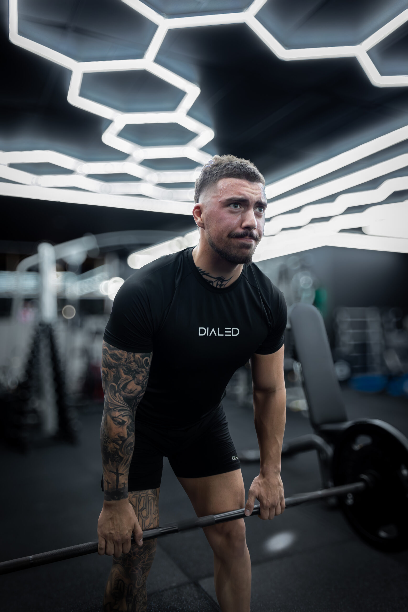 The second shoot was conducted in a commercial gym with distinct hexagon lighting. This environment allowed for dynamic action shots of two models exercising in the clothing. Capturing these images in an authentic gym setting added depth to the campaign by showcasing the versatility and functionality of the activewear. The gym’s lighting also created a strong visual impact, with the hexagons providing a modern, almost futuristic aesthetic that complemented the sleek designs of the garments. Reflecting on brands such as ‘Gymshark’,I took inspiration on some good poses that showcase the brand logo and make for an entertaining composition.